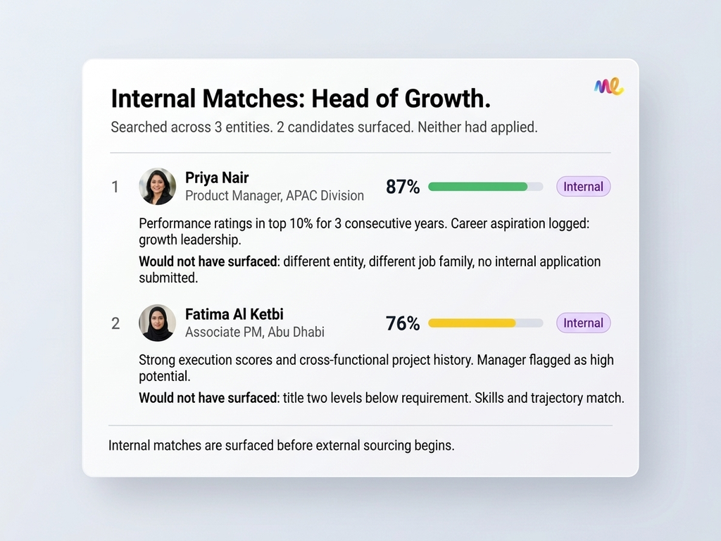 - يفحص ملفات الموظفين والمهارات وطموحاتهم المهنية لإبراز المرشحين الداخليين قبل أن تذهب الطلبات للخارج. تشمل المطابقة عبر الكيانات.