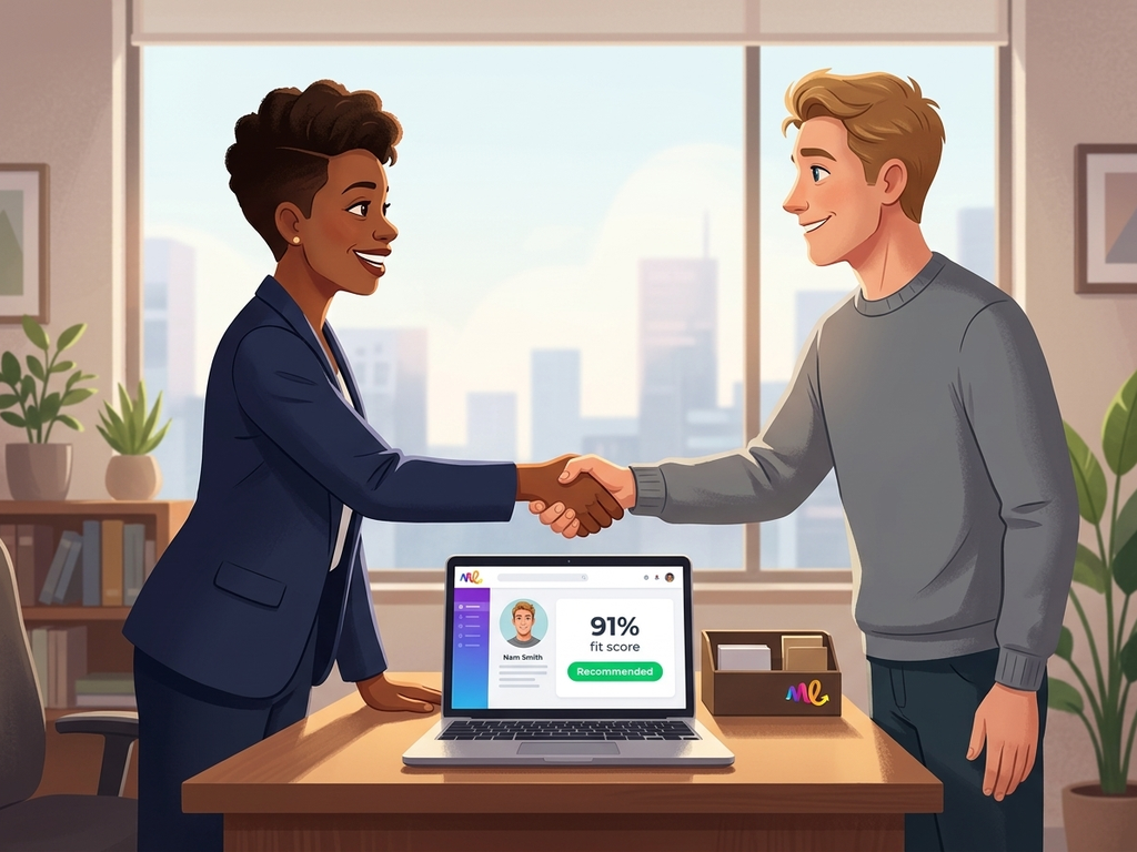- يبدأ بتحليل دلالي قائم على LLM ومعايير صناعية للحصول على دقة أساسية من اليوم الأول. مع تراكم بيانات التعيين والأداء، تتولى نماذج ML تدريجياً المهمة. بحلول الشهر الثاني عشر، يصل التقييم عادة إلى ارتباط 0.55+ مع النتائج، متفوقاً على المقابلات غير المنظمة.