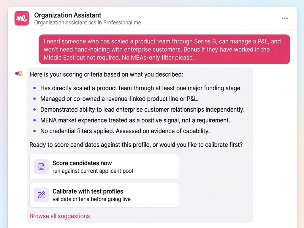 ابدأ المحادثة. عرّف الدور. شاهد المرشحين المؤهلين خلال دقائق.