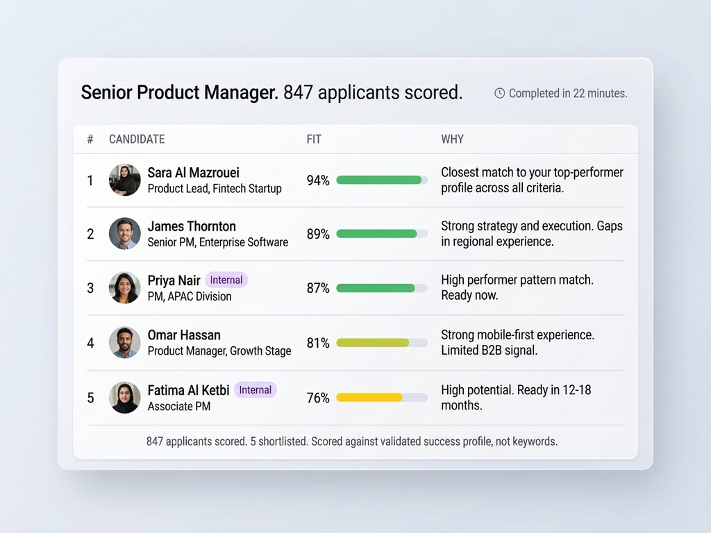 - يقيم المرشحين مقابل ملفات النجاح المستمدة من أفضل المؤدين لديكم. تفصيل منظم مع مستويات ثقة، ليس رقمًا غامضًا.