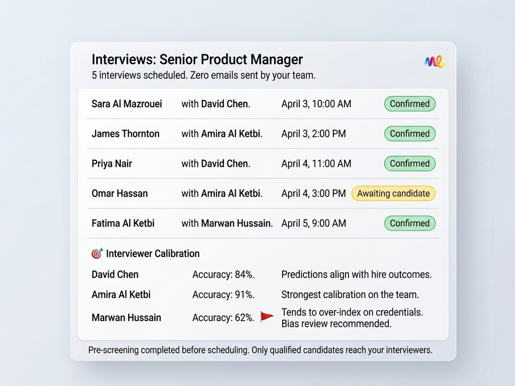 يقوم الفحص المسبق الآلي بفلترة المرشحين. يقوم الجدولة الآلية بحجز المقابلات دون مراسلات مع مسؤول التوظيف. تقيس المعايرة كل عضو لجنة من حيث الدقة والاتساق وأنماط التحيز.
