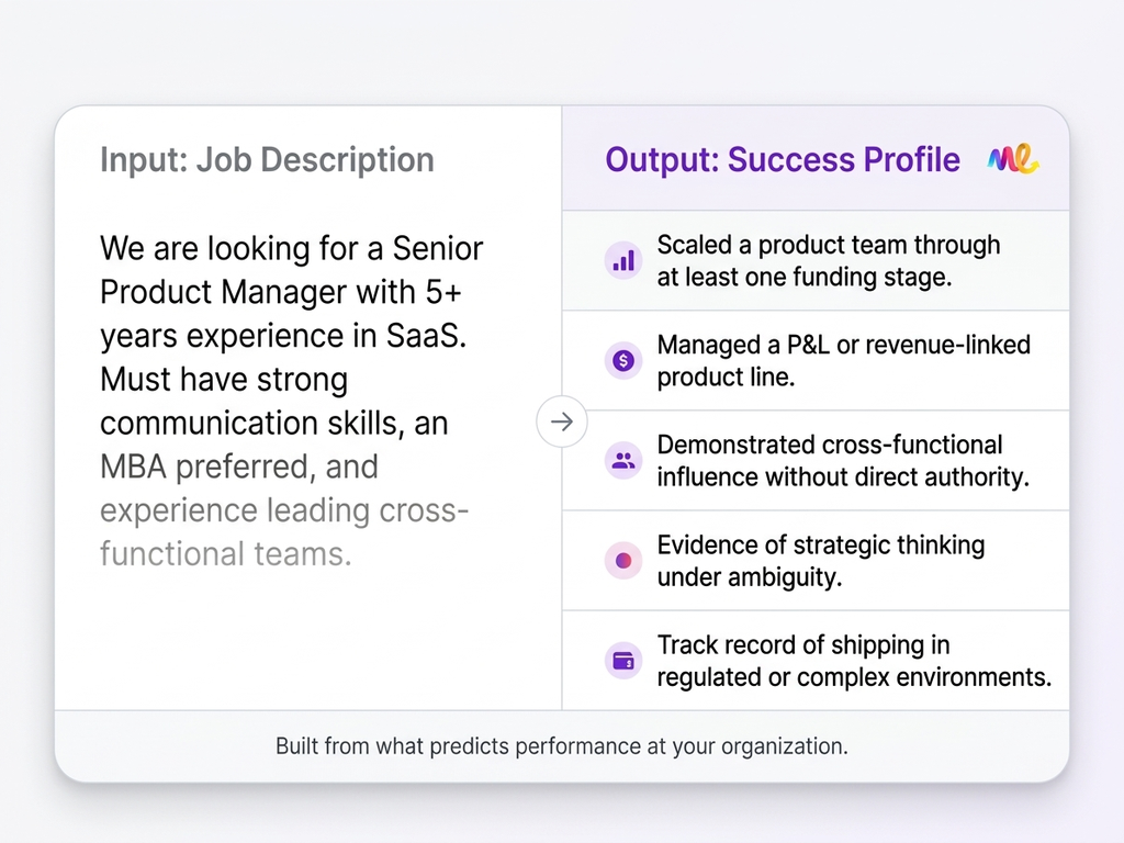 أرسل وصفًا وظيفيًا في Slack أو Teams أو WhatsApp. تحول Meg الوصف إلى ملف نجاح تنبؤي مبني على ما يتنبأ بالأداء فعليًا، لا على مطابقات الكلمات المفتاحية.