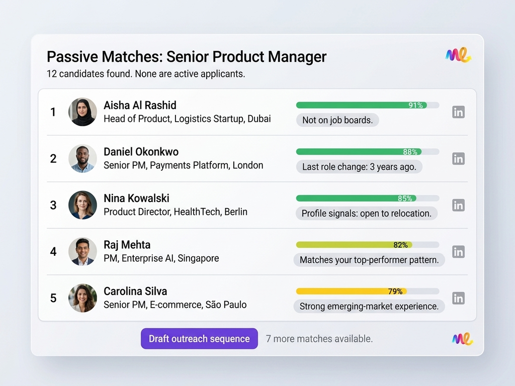 يصنّف المرشحين مقابل ملف أفضل المؤدين لديكم. يكشف عن المواهب الداخلية قبل الإنفاق على الوكالات. ينبه عندما تكون معاييركم أو تعويضاتكم غير كافية. يبدأ في Slack.