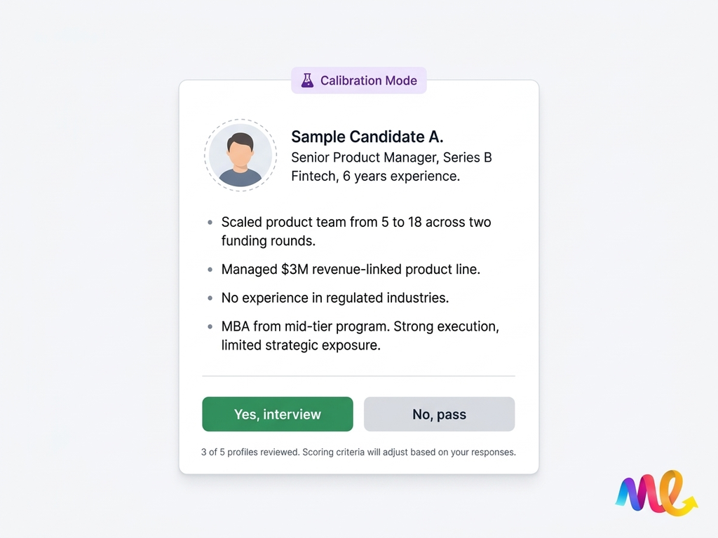 - تولّد Meg ما بين 5 إلى 10 ملفات مرشحين وهميين قبل نشر الدور. يراجع مدير التوظيف كل ملف: إجراء مقابلة أو تمرير. هذا يوافق المتطلبات المصرّح بها مع تفضيلات الاختيار الفعلية، ويكتشف عدم التطابق قبل دخول المرشحين الحقيقيين إلى خط الأنابيب.
