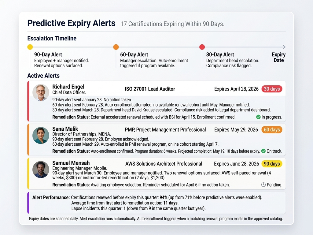 - يراقب كل شهادة مقابل متطلبات الدور مع تنبيهات استباقية عند 90 و60 و30 يومًا. يقلل حوادث انقضاء الشهادات بنسبة 90–97%. جاهز للتدقيق من اليوم الأول.