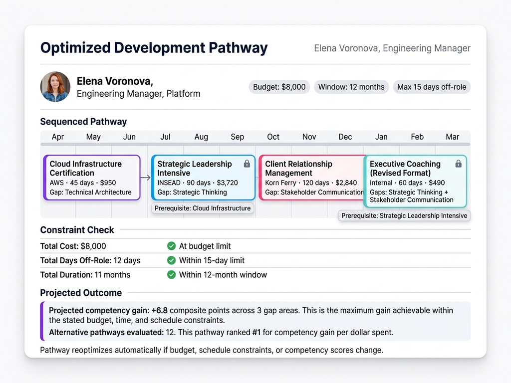 - ينشئ خطط تطوير متسلسلة بناءً على الفجوات المقاسة، والأهداف المهنية، وبيانات فعالية البرامج. بوصلة للتطوير، لا كتالوج دورات.