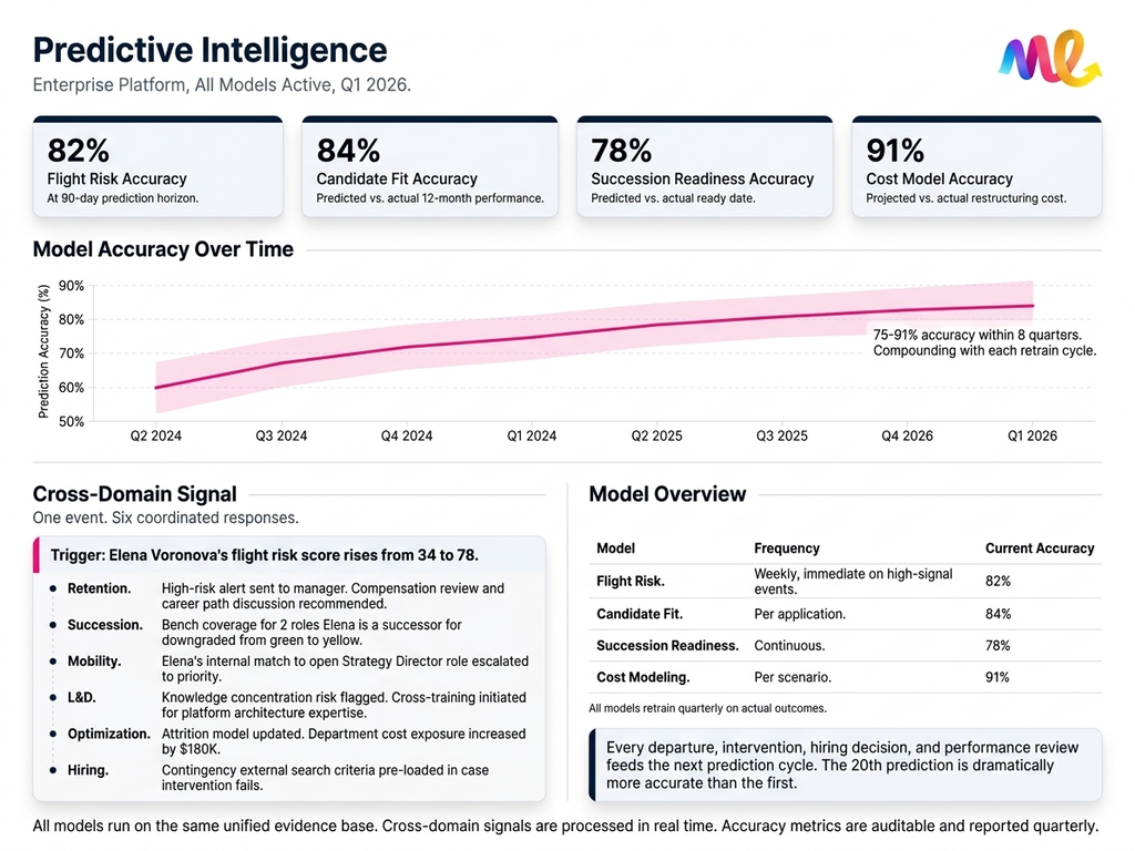 تبدأ النماذج التنبؤية بمقاييس معيارية صناعية لدقة خط الأساس من اليوم الأول. مع تراكم بيانات النتائج في منظمتكم، تعيد النماذج تدريبها ربع سنويًا. يصل توقع مخاطر الرحيل إلى 75-85% دقة خلال اثني عشر شهرًا. يصل تقييم ملاءمة المرشح إلى ارتباط 0.55+ مع نتائج الأداء. يصبح كل مجال أكثر حدة لأن كل مجال يغذي المجالات الأخرى.
