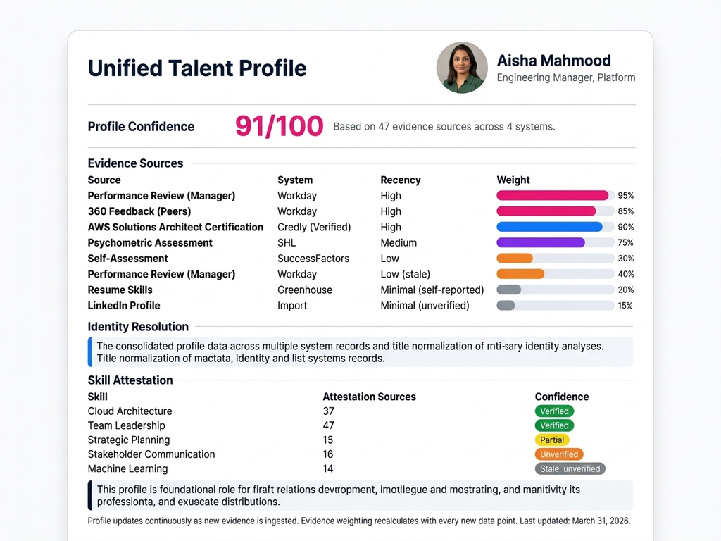 تزِن الشهادة المصدّقة حكوميًا أكثر من مهارة مُصرَّح بها ذاتيًا. تزن مراجعة أداء قبل ستة أشهر أكثر من مراجعة قبل ثلاث سنوات. لتقييمات المديرين وزن مختلف عن التقييمات الذاتية. تطبّق المنصة وزن الأدلة على كل نقطة بيانات حتى يعكس الملف القدرة المثبتة لا المُدَّعاة. بالنسبة للمؤسسات التي تُشغّل 10-20 نظامًا للموارد البشرية، هذا الفرق بين مشروع تحليلات الأشخاص الذي يستغرق ستة أشهر وطبقة ذكاء تعمل منذ الأسبوع الثالث.