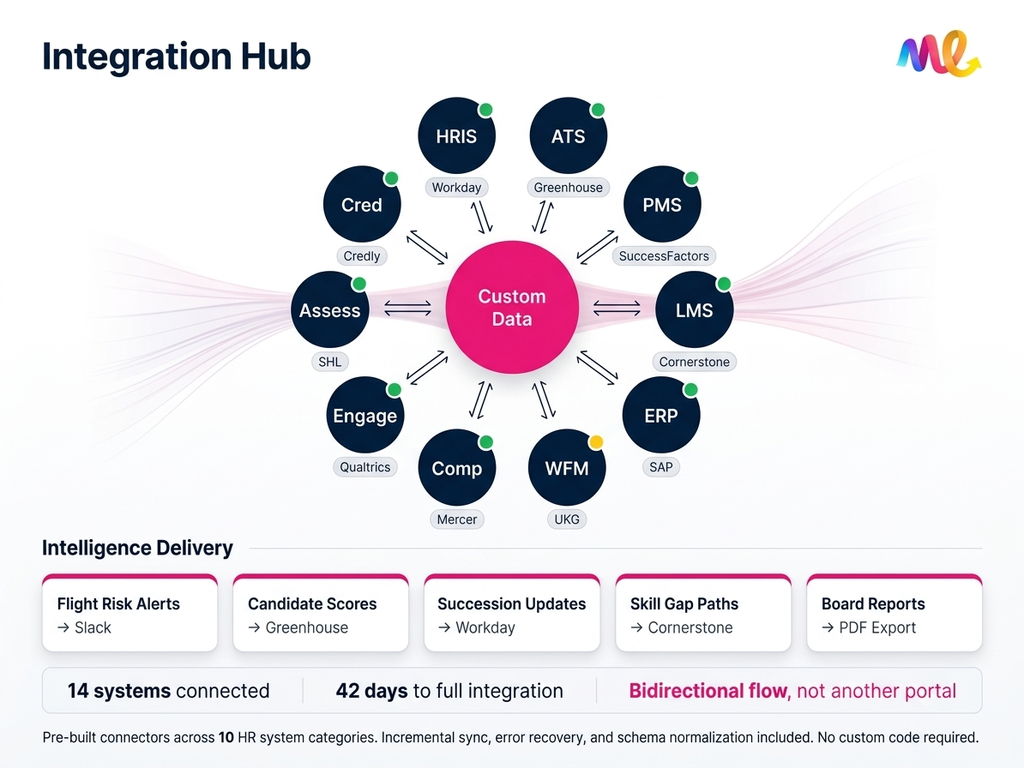 - لا. إنها تجلس فوق بنيتكم كطبقة ذكاء. تتدفّق البيانات من HRIS وATS وLMS وأنظمتكم الأخرى. يتدفق الذكاء مرة أخرى عبر تلك الأدوات نفسها عبر واجهات برمجة التطبيقات والتنبيهات والدرجات المدمجة. تستمر فرقكم في العمل في أماكنها المعتادة. لا يتعيّن على أحد تعلم أداة جديدة.