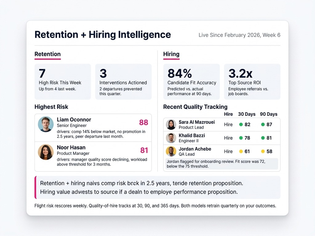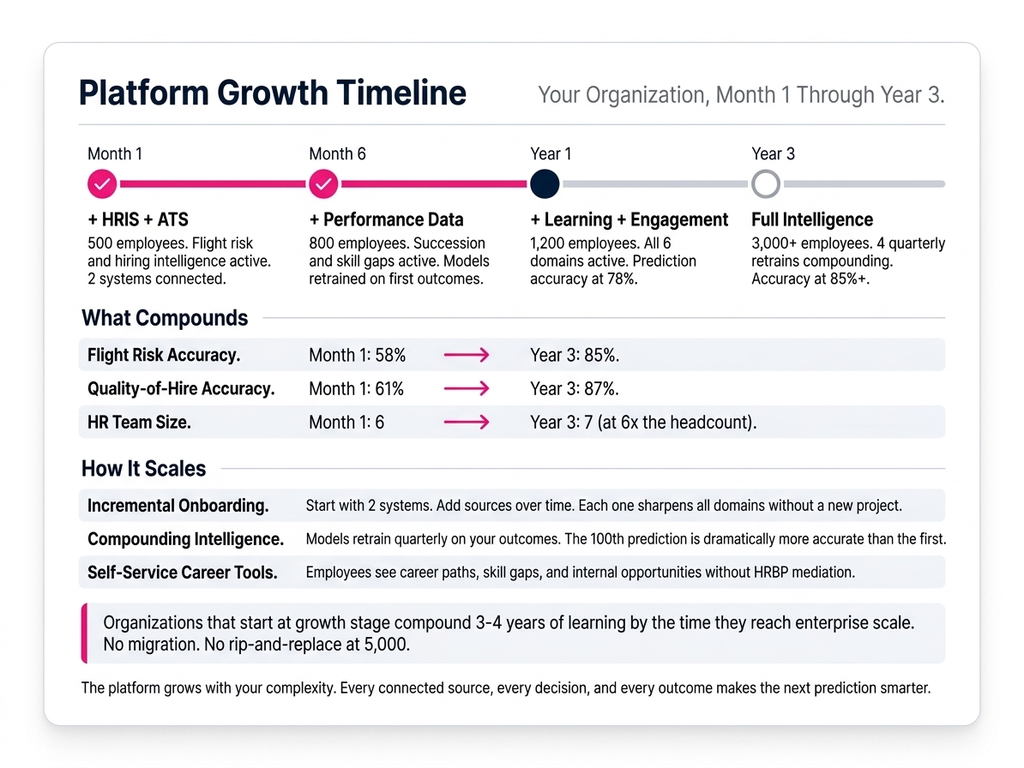 تتراكم الاستخبارات مع نمو بياناتك. تُعيد نماذج مخاطر الرحيل تدريبها ربعياً على رحيلاتك الفعلية. تتحسّن درجات التوظيف مع تراكم بيانات جودة التوظيف. يصبح تحليل الفجوات المهارية أكثر دقة مع كل دورة أداء. سنة من التشغيل تنتج نتائج أدق بكثير من الشهر الأول.