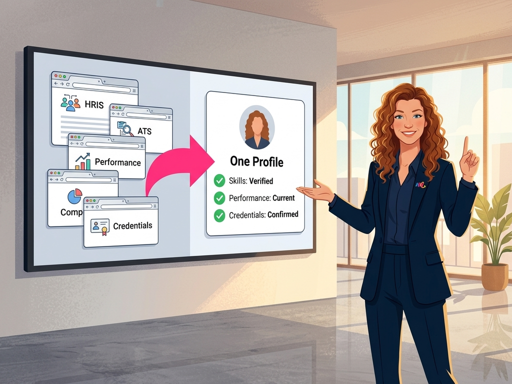 تواجه المنظمات النامية جدارًا عندما تتجزأ بيانات الأشخاص عبر ثلاث إلى خمس أنظمة. يعرف HRIS من يعمل هنا. يعرف ATS من تقدم للوظائف. يعرف أداة الأداء من الذي يقدّم النتائج. لا أحد يملك الصورة المترابطة. تحل المنصة هذه الشظايا إلى ملفات موحدة خلال أسبوعين من التكامل. معالجة الهوية تتعامل مع نفس الشخص الذي يظهر كسجلات مختلفة عبر الأنظمة. تطبيع المخطط يُحوّل المسميات الوظيفية والمستويات غير المتسقة إلى هيكل مشترك.