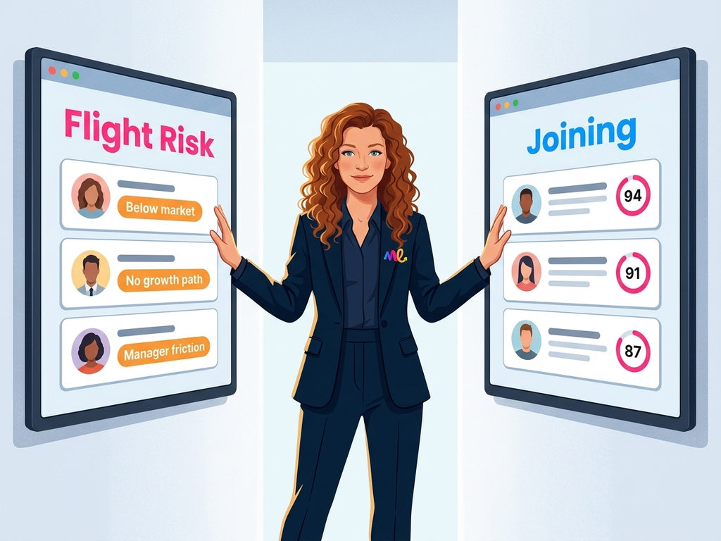 عند 500-5,000 موظف، كل مغادرة تؤلم. يشعر HRBP بالمخاطر عبر العلاقات، لكن الحدس لا يتوسع بعد 200 شخص. تُقيّم المنصة مخاطر الرحيل أسبوعيًا باستخدام فجوات التعويض، واتجاهات الانخراط، وتكتلات رحيل الأقران، وجودة المدير. عندما تتجاوز الدرجة عتبة، يسمي النظام أهم المحركات ويوصي بتدخلات محددة متناسبة مع كل شخص.