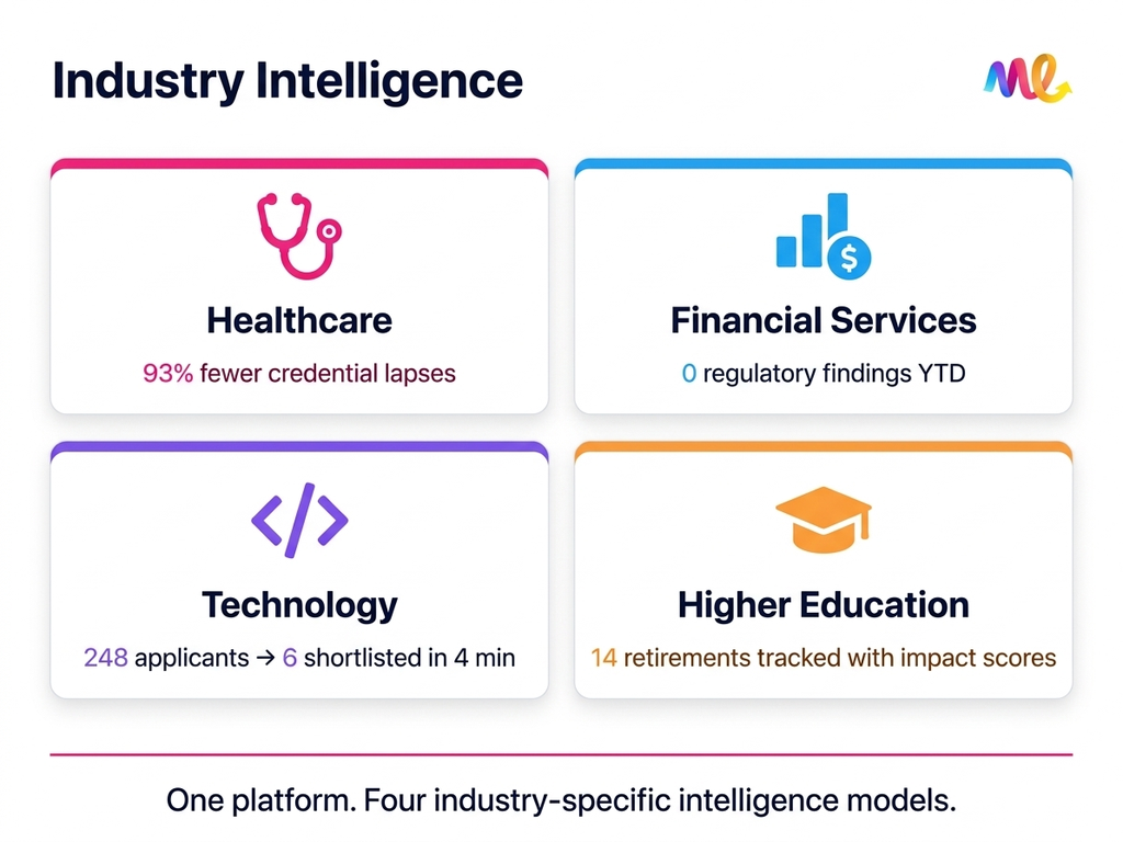 تتصل المنصة بنفس فئات أنظمة الموارد البشرية عبر كل صناعة: HRIS، ATS، PMS، LMS، ERP، وأنظمة التحقق من المؤهلات. ما يتغير هو كيفية وزن النماذج الذكية للإشارات، وأطر الامتثال المطبقة، والنتائج التي تهم قيادتكم أكثر.