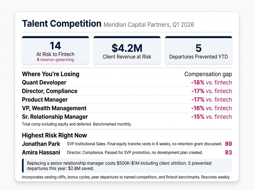 تتلاقى الضغوط التنظيمية ومنافسة fintech ومقاعد القيادة المتناقصة. تحوّل المنصة بيانات القوى العاملة المبعثرة إلى استخبارات يمكن لضباط الامتثال وكبار مسؤولي الموارد البشرية (CHROs) اتخاذ إجراءات بناءً عليها قبل أن تتحول الفجوات إلى ملاحظات.