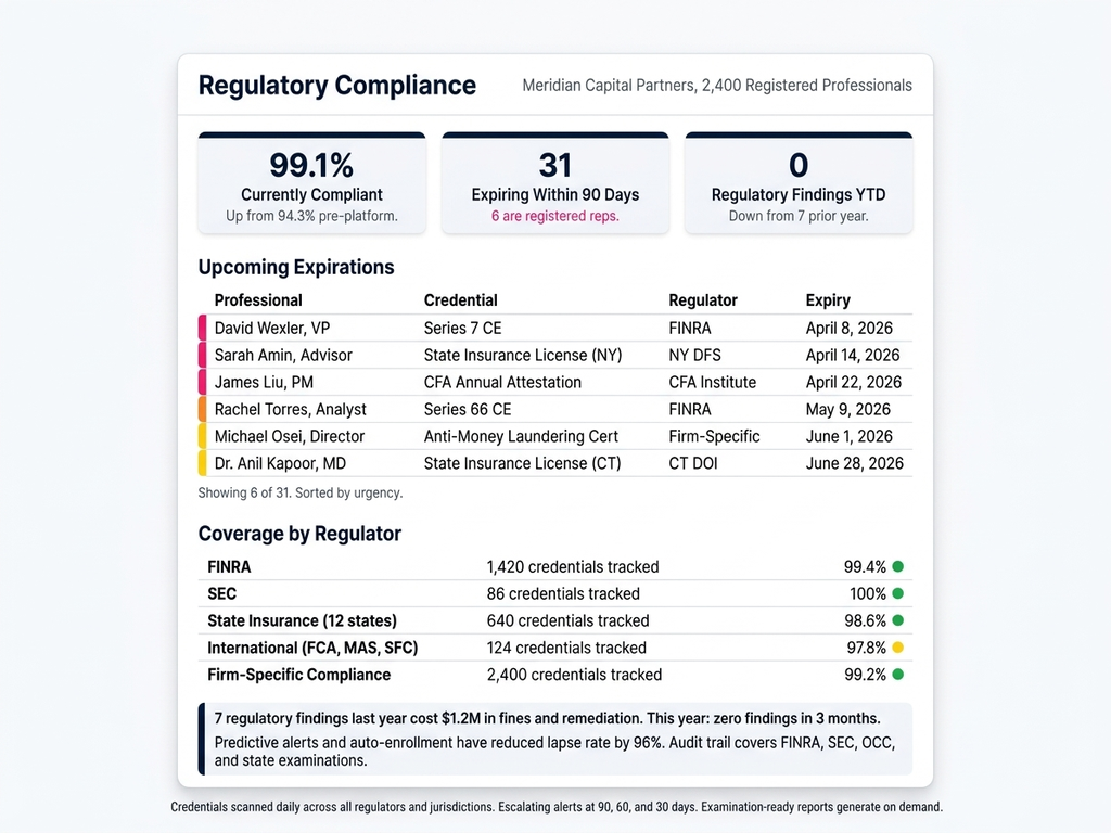 ممثل مسجل تتأخر متطلبات CE لسلسلة Series 7 لديه خرق امتثالي. مدير محفظة تنقضي رخصته أو شارتَر CFA الخاصة به يثير مسألة وصاية. مستشار تأمين يعمل في ولاية انتهت رخصته فيها يشكّل حدثًا تنظيميًا. تتبع معظم الشركات هذه الأمور في أنظمة منفصلة تظهر المشكلات بعد أن تصبح ملاحظات بالفعل.