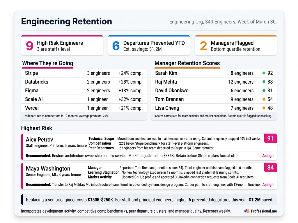 يتبع تسرب المهندسين في شركات التكنولوجيا أنماطًا تظهر قبل الاستقالة بأشهر. انخفاض تكرار الالتزامات، تقليل المشاركة في مراجعات الكود، تفويت فرص التعلم، وزملاء يغادرون إلى نفس المنافس كلها إشارات تراها البيانات قبل أن يلاحظ المدير. يستوعب النظام هذه الإشارات جنبًا إلى جنب مع فجوات التعويض، سرعة الترقيات، وبيانات الانخراط لتقييم مخاطر الرحيل أسبوعيًا.