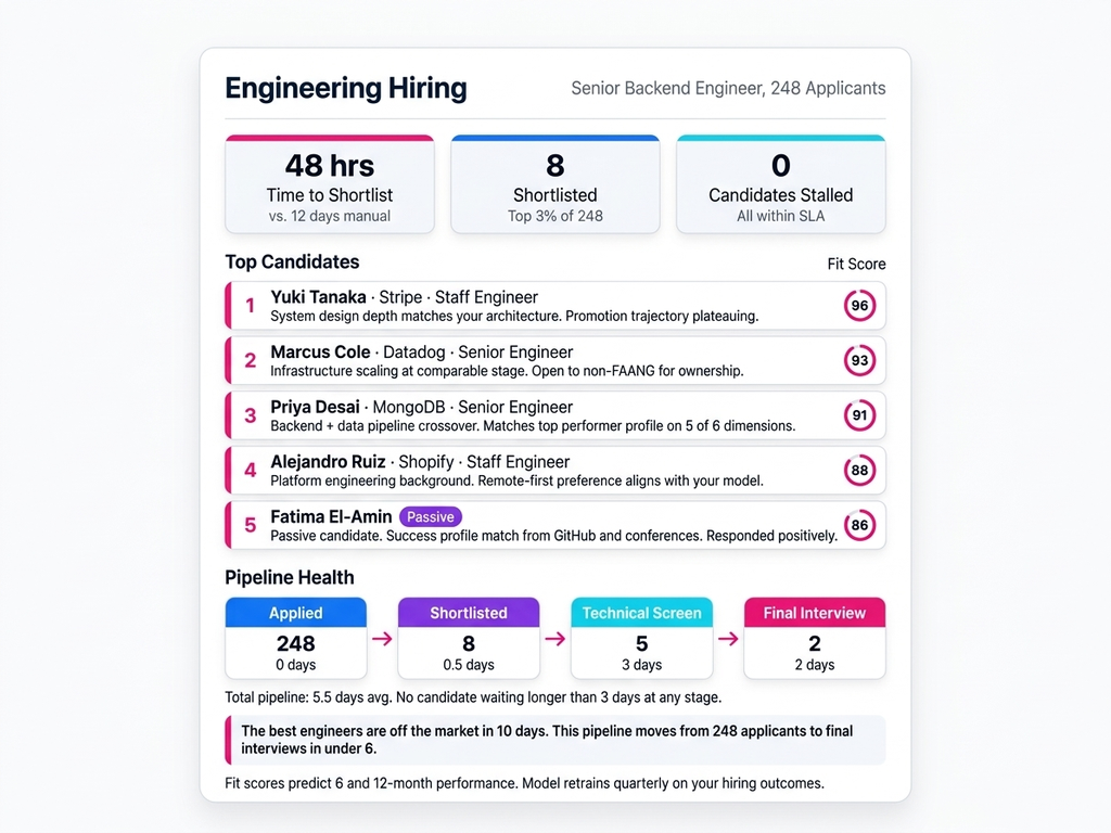 أفضل المهندسين يكونون خارج السوق خلال 10 أيام. عمليتك تستغرق 45. يقلص النظام وقت الوصول إلى القائمة المختصرة المؤهلة إلى 48 ساعة، يقيم المرشحين على ما يتنبأ بنجاح الهندسة، ويحافظ على تدفق قناتك أسرع من أن ينفصل المرشحون.